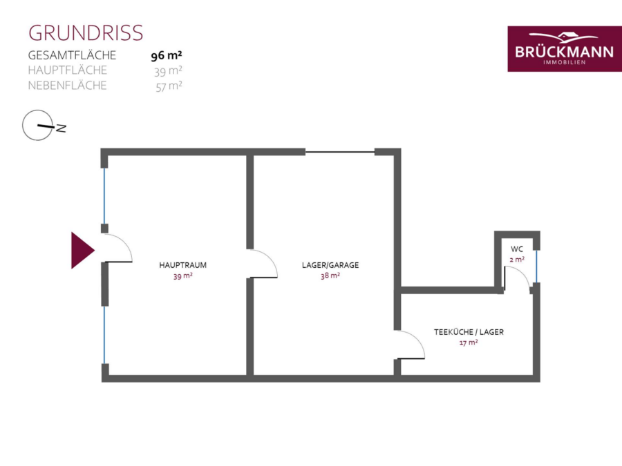 Sie besteht aus einem repräsentativen Hauptraum, einer angrenzenden Garage mit Rolltor, die sich auch als Lager nutzen lässt, einer Teeküche und einem WC für Ihre Mitarbeiter:innen oder Kund:innen.