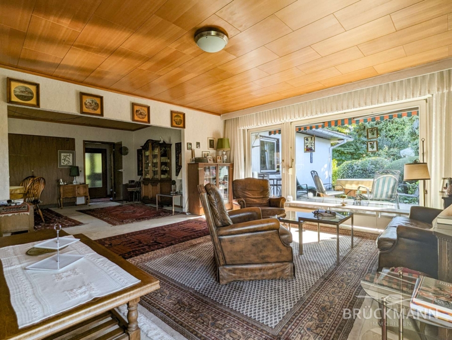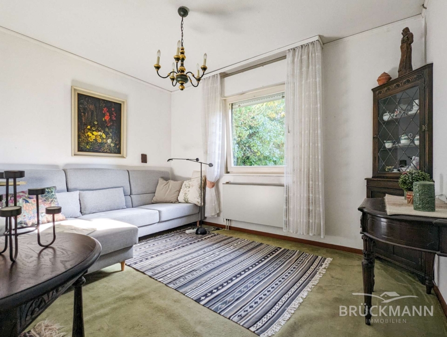 Einen schützenden Windfang mit anliegendem Gäste-WC | eine Diele mit Garderobe | eine Küche, die sich relativ leicht in eine moderne, offene Wohnküche umgestalten ließe | ein großzügiger Wohn- und Essbereich mit einem traumhaften Blick ins Grüne | ein praktischer kleiner Abstellraum, der Stellplatz für Waschmaschine und Trockner (übereinander) bietet.