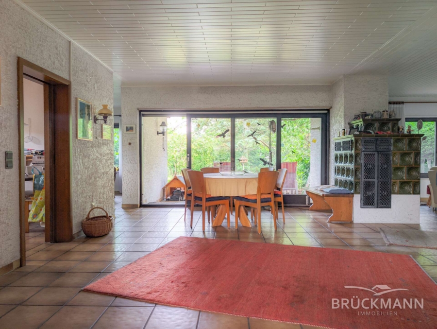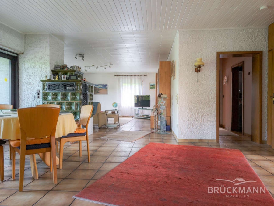 Die Ausstattung entspricht weitgehend dem Baujahr: doppelt verglaste Holzrahmenfenster mit Rollläden, elektrische Installationen im Ursprungszustand und Holzbalkendecken mit weiß lackierten Holzpaneelen. Im Erdgeschoss sorgt eine Fußbodenheizung für angenehmes Raumklima und im Wohnzimmer steht ein Kachelofen, derzeit allerdings nicht betriebsbereit. Der Garten verfügt über eine ausreichende Größe und ist nach Westen ausgerichtet – sonnig, weit und gut für all Ihre Zwecke nutzbar!