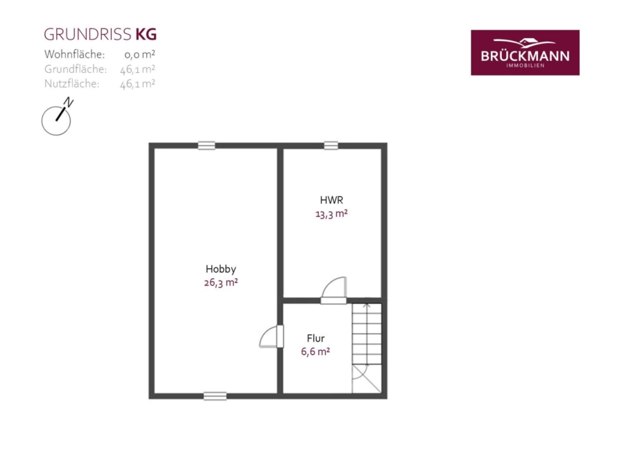 Im Kellergeschoss stehen Ihnen weitere 46 m² Nutzfläche für einen Hauswirtschaftsraum, einen Hobbyraum und einen Vorraum zum Lagern zur Verfügung.