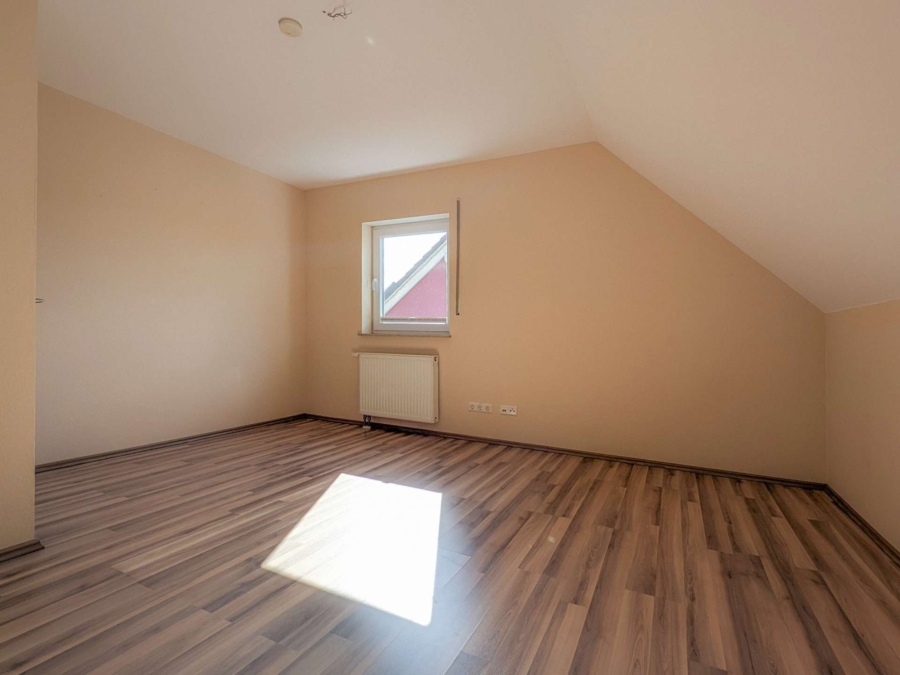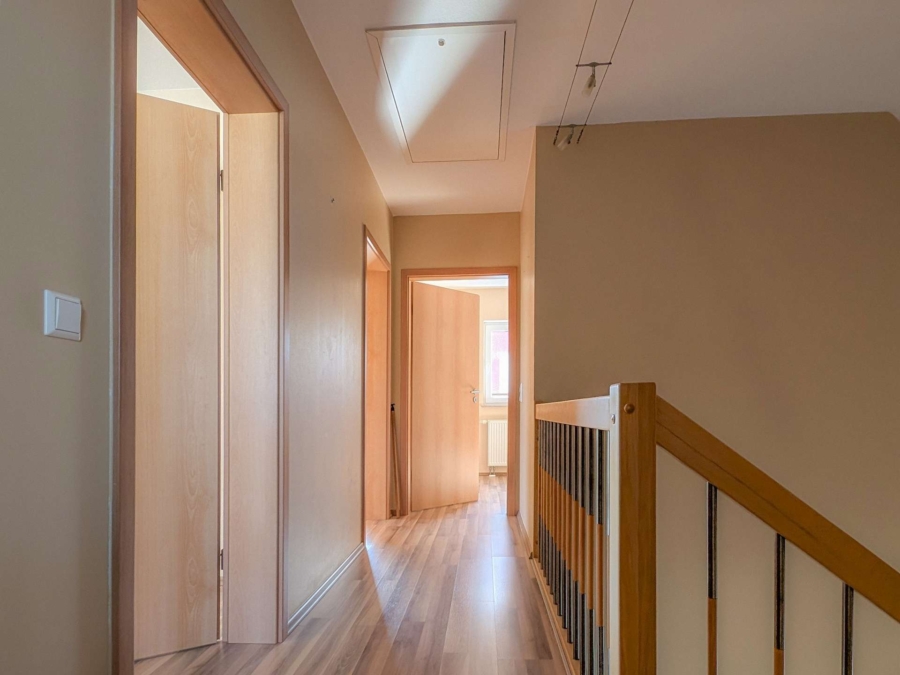 Im Obergeschoss befinden sich auf weiteren 58 m² Wohnfläche drei Schlafzimmer, ein gut dimensioniertes Tageslichtbad mit Wanne und Dusche sowie ein kleiner Balkon zur Südseite, der von gleich zwei Schlafzimmern aus begangen werden kann. Das Dachgeschoss ist nicht zu Wohnzwecken ausgebaut, aber bietet mit zwei Räumen einiges an praktischer Nutzfläche zum Lagern von Dingen oder Nachgehen von Hobbies.