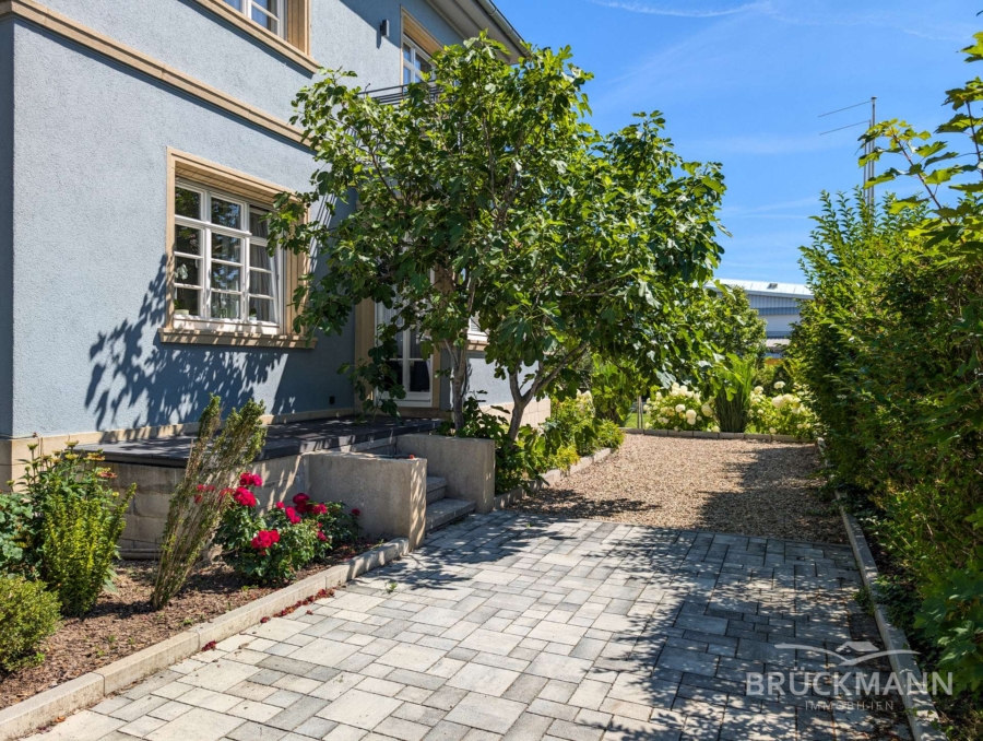 Doch zunächst beginnen wir in der großzügig gestalteten Einfahrt. Am Tor zum Grundstück liegt übrigens bereits ein Stromanschluss, wodurch später leicht auch ein elektrisches Tor installiert werden könnte. Auf dem Weg zum Wohnhaus passieren Sie einen klar gegliederten und ruhig wirkenden Garten/Vorplatz, in dem schon bald wieder zahlreiche Hortensien blühen werden. Auch der erste Anblick des Gebäudes mit seiner symmetrischen, klar strukturierten Fassadengestaltung erweckt einen ordentlichen und repräsentativen ersten Eindruck. Dabei hat das freistehende Einfamilienhaus mit seinem seitlichen Erker, auf dem sich ein Balkon am Schlafzimmer darüber befindet, seinem Walmdach mit Schiefereindeckung und der pastellblauen Fassade mit seinen Sandstein Gesimsen und Faschen seinen ganz eigenen, ansprechenden Charme für Ihre Gäste, Kunden oder Klienten…