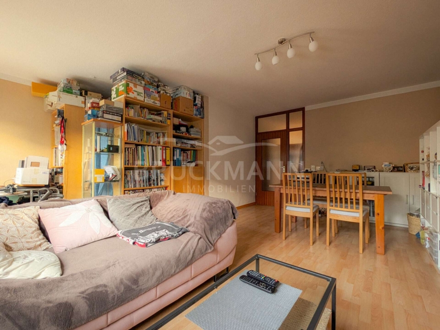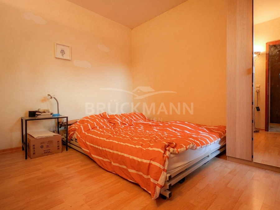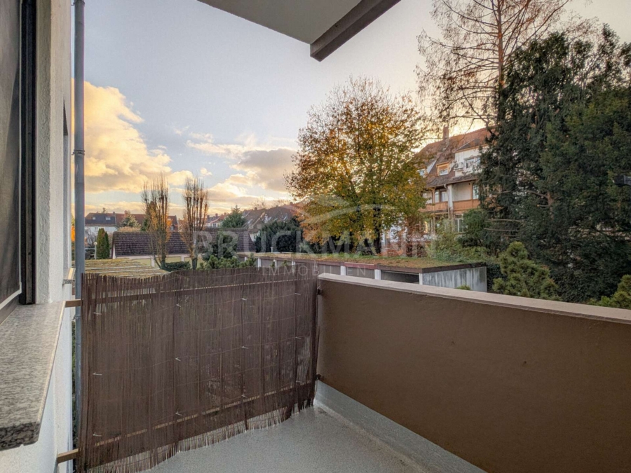 Beim Betreten der Wohnung öffnet sich eine kleine Diele, von der alle Räume erreichbar sind. Links liegt das Schlafzimmer mit Platz für ein Doppelbett und einen Schrank. Geradeaus befindet sich die Küche und rechts gelangt man zum Badezimmer und in einen größeren Wohnbereich, der aktuell von den Mietern noch einmal unterteilt ist. Die Fensterflächen lassen ausreichend Tageslicht herein und der überdachte Westbalkon erweitert den Wohnraum nach draußen – ideal für den Feierabend in der Sonne. Der Grundriss ist klar und funktional; er lässt sich sowohl für Singles als auch für Paare gut möblieren. Laminatböden in Wohn- und Schlafräumen, Fliesen in Küche und Bad sowie doppelt verglaste Holzfenster schaffen eine sachliche, pflegeleichte Atmosphäre.