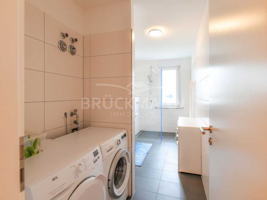 Das Schlafzimmer ist angenehm geschnitten und wird durch einen vorgelagerten Ankleidebereich ergänzt, der sich zugleich als ruhiger Arbeitsbereich eignet. Diese zusätzliche Zone schafft Flexibilität im Alltag, ohne dass ein separates Zimmer erforderlich ist. Die Ausstattung ist durchgehend zeitgemäß: Fußbodenheizung, Stäbchenparkett in den Wohnräumen, Fliesen in Bad und Küche sowie eine moderne Haustechnik mit Nahwärmeversorgung über ein hauseigenes Blockheizkraftwerk. Große, bodentiefe Fensterflächen sorgen für eine gute Belichtung, während Rollläden zusätzlichen Komfort bieten.