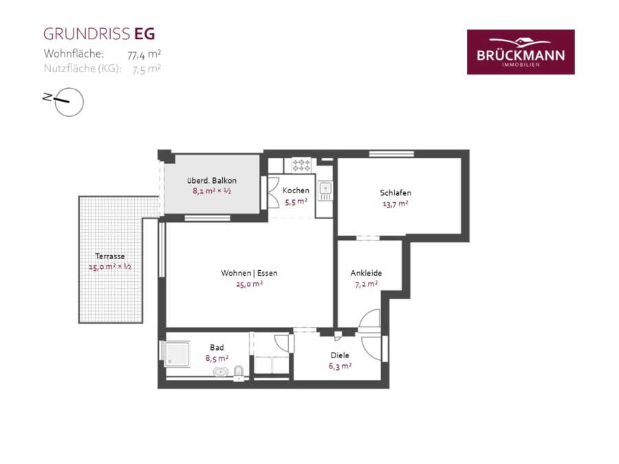 Beim Betreten empfängt Sie eine kompakte Diele, von der aus alle Räume sinnvoll erschlossen werden. Direkt angrenzend liegt das Tageslichtbad mit ebenerdiger Dusche sowie Platz für Waschmaschine und Trockner. Der zentrale Wohn- und Kochbereich öffnet sich mit rund 30 m² als heller, zusammenhängender Raum, der durch die integrierte Einbauküche und den direkten Zugang zu einem überdachten Balkon überzeugt. Von hier aus geht es unmittelbar auf einen weiteren Freisitz (Terrasse) und in den eigenen Garten – ein Bereich mit ca. 100 m², der den Wohnraum spürbar erweitert und vielseitig nutzbar ist.