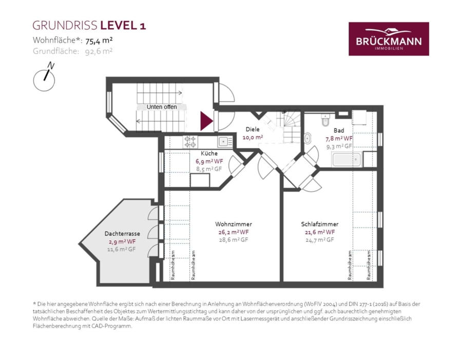 Die angegebene Wohnfläche bei den Grundrissen ergibt sich durch Berechnung gemäß Wohnflächenverordnung (WoFlV 2004) auf Basis der tatsächlichen Beschaffenheit des Objektes zum Angebotszeitpunkt und kann daher von der ursprünglichen und ggf. auch baurechtlich genehmigten Wohnfläche abweichen. Quelle der Maße: Aufmaß der lichten Raummaße vor Ort mit Lasermessgerät und anschließender Grundrisszeichnung einschließlich Flächenberechnung mit CAD-Programm.
