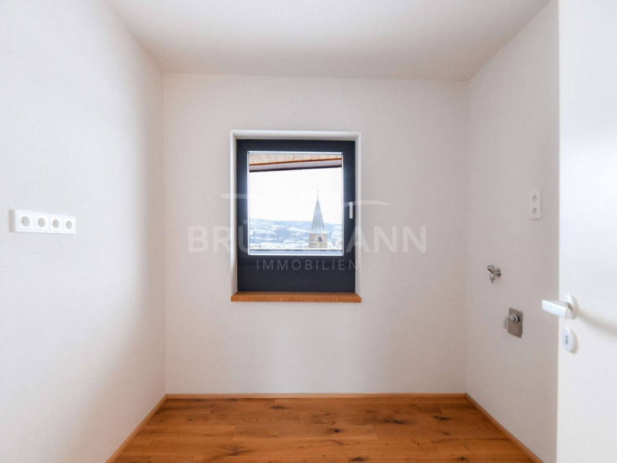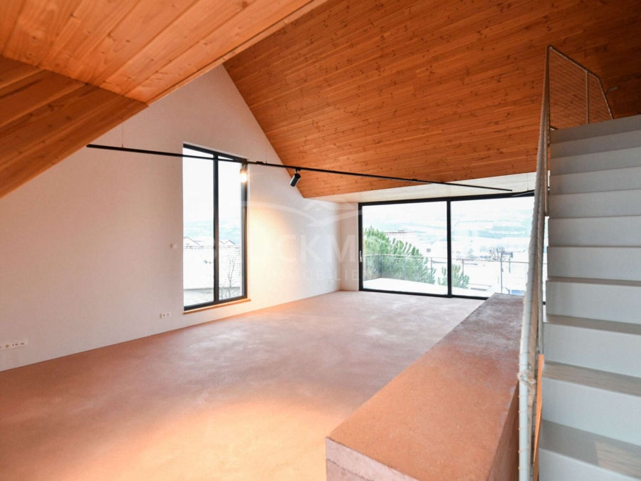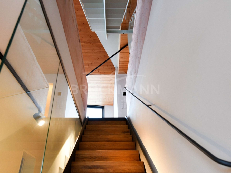 Über die interne Treppe öffnet sich im zweiten Obergeschoss der zentrale Wohnbereich. Der großzügige Wohn- und Essraum ist offen gehalten und lebt von Volumen, Licht und Materialität. Die durchgehende Holzdecke verleiht dem Raum Wärme und Ruhe, während große Fensterflächen den Blick über den Ort und die Landschaft freigeben. Die hochwertige Küche mit Kochinsel ist integraler Bestandteil des Raums und nicht als Nebenfunktion gedacht. Hier wird nicht inszeniert, sondern gelebt. Der nach Norden ausgerichtete Balkon ergänzt diese Ebene als ruhiger Außenraum mit Weite und Ausblick. Ein Gäste-WC sowie eine Kammer fügen sich funktional ein, ohne den offenen Charakter zu stören.