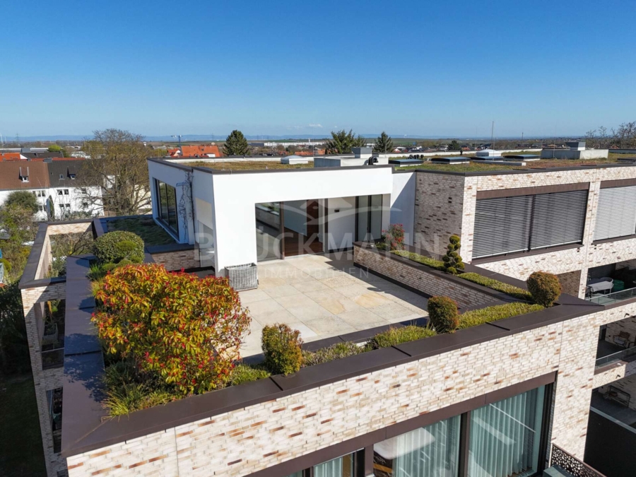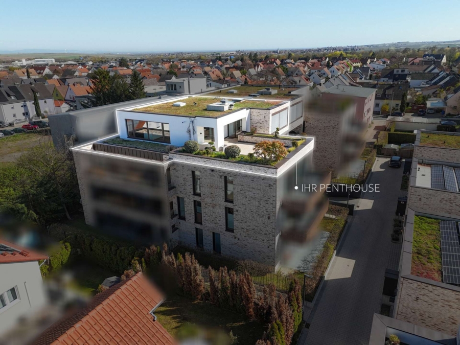 Die 2018 errichtete, hoch energieeffiziente Wohnanlage aus der Feder von P4-Architekten mit nur zehn Einheiten (in diesem Gebäudeteil) liegt von der Saarlandstraße zurückversetzt in einem ruhigen Wohngebiet von Grünstadt und wird überwiegend von Eigentümern bewohnt. Die klare, moderne Architektur und die gepflegte Umgebung vermitteln bereits beim Ankommen ein Gefühl von Klasse, Stil und Zurückgezogenheit. Der direkte Zugang aus der Tiefgarage über den Aufzug mit exklusiver Schlüsselfunktion bis in die Wohnung unterstreicht den privaten Charakter dieses Penthouses.