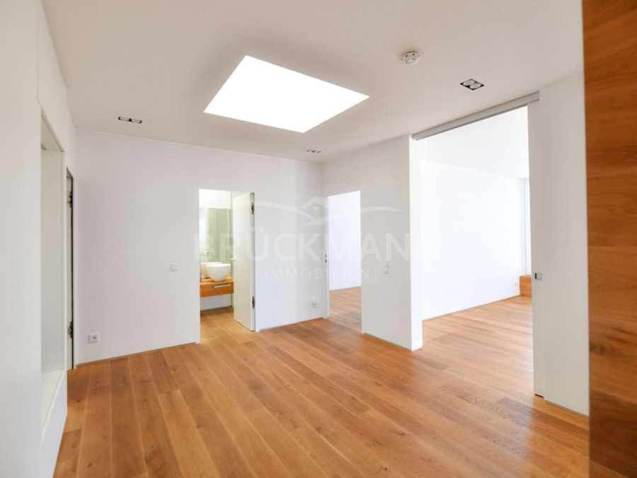Der private Bereich ist klar abgetrennt: Das Master-Schlafzimmer verfügt über direkten Zugang zur östlichen Terrasse, eine eigene Ankleide sowie ein Tageslichtbad en Suite. Ein weiteres Zimmer eignet sich flexibel als Gäste-, Kinder- oder Arbeitszimmer. Ergänzt wird das Raumangebot durch ein zusätzliches Zimmer für Arbeiten oder Schlafen, ein separates Gäste-Duschbad sowie einen Hauswirtschaftsraum. Die durchgängige Ausstattung mit Eiche-Parkett, Fußbodenheizung, bodentiefer Verglasung und hochwertigen Materialien sorgt für ein stimmiges und wertiges Gesamtbild.